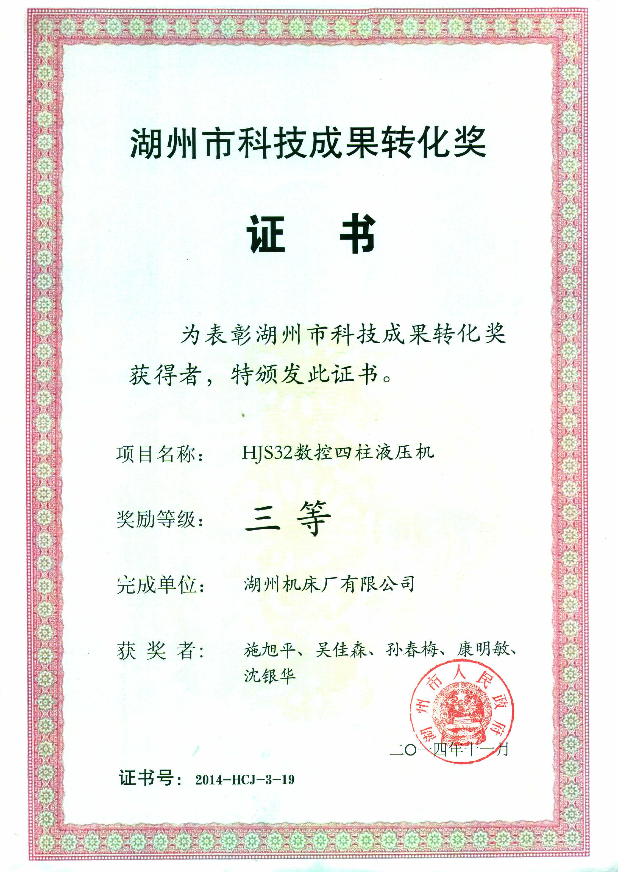 The company granted ISO9001 certification, set up a provincial R & D center and cooperates closely long-term with Zhejiang University and Shanghai Jiao Tong University to develop new product and technology. HMTW has succeeded in designing and manufacturing large-scale, digital, special-purpose, sophisticated hydraulic presses and production lines tonnage from 10 to 150000 KN for more than fifty years. Now the products with four-column, straight-side, C-frame and horizontal, are in wide applications to general-purpose, metal plate forming, bulk metal forming, pipe, powder ware, rubber and plastic ware,electric motor, vehicle wheel, special-purpose pressing, hot stamping for high-strength steel plate, interior high-pressure forming, automobile longitudinal beam, NC servo, precise punching, glass fiber reinforced plastics (SMC), carbon extruding,vehicle door edging, part straightening and glass ware etc. in total of more than 50 series and 400 varieties, a lot of products are entitled with National Important New Product and Provincial Key Manufacture Industry First-set Product. HMWT has obtained hundreds of national invention patents and rewarded with a title of “ Patents demonstration enterprise in Zhejiang " .