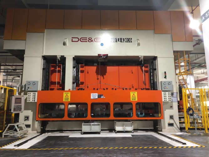 多工位液壓機可視為多臺液壓機及拆垛送料系統的集成,即一臺多工位壓力機相當于一條自動化壓力機生產線,一般由線首拆垛單元、送料機構、壓力機和線尾出料單元組成;主要用于拉深、沖裁、彎曲等連續生產工藝,采用獨立的糾偏控制系統,實現液壓機滑塊相對于工作臺平行壓制。